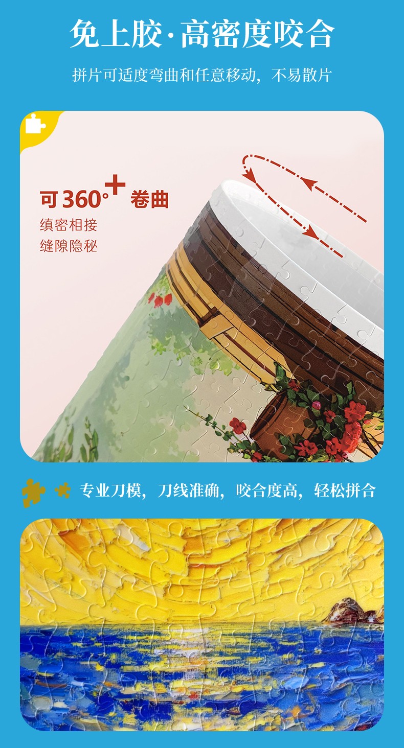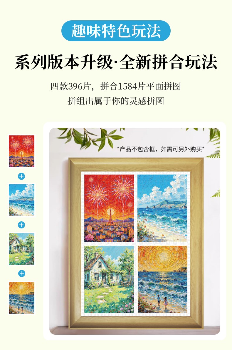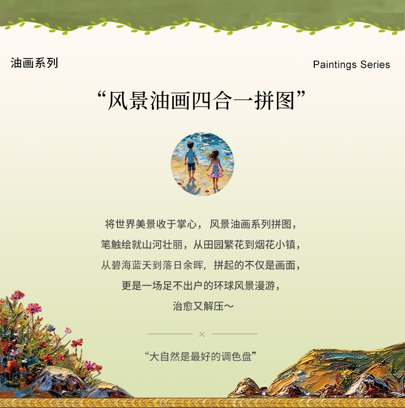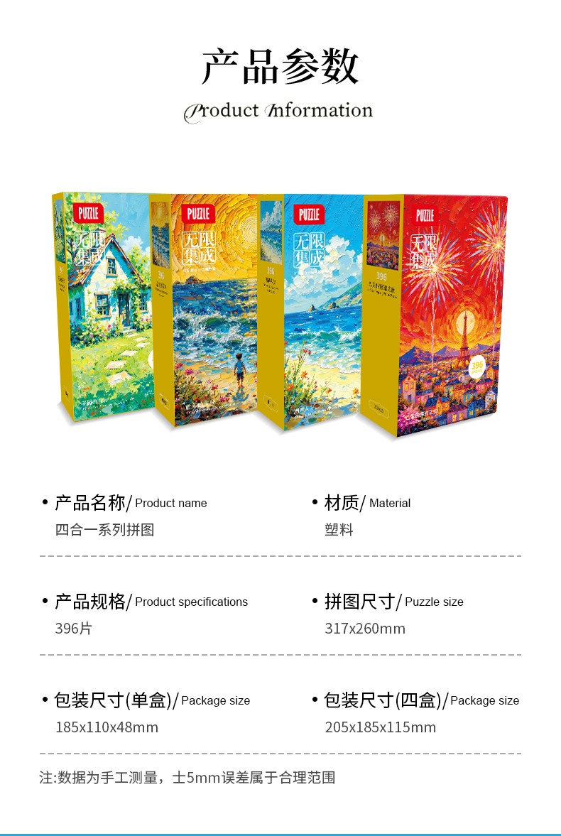 拼圖名稱:四合一塑料平面油畫拼圖 材質:塑料 拼圖尺寸:317*260mm 拼圖片數:1000片 加工方式:廠規、來圖定制 單盒包裝尺寸:185*110*48mm 四合一系列套裝:205*185*110mm