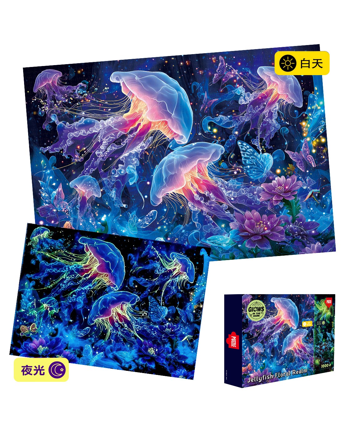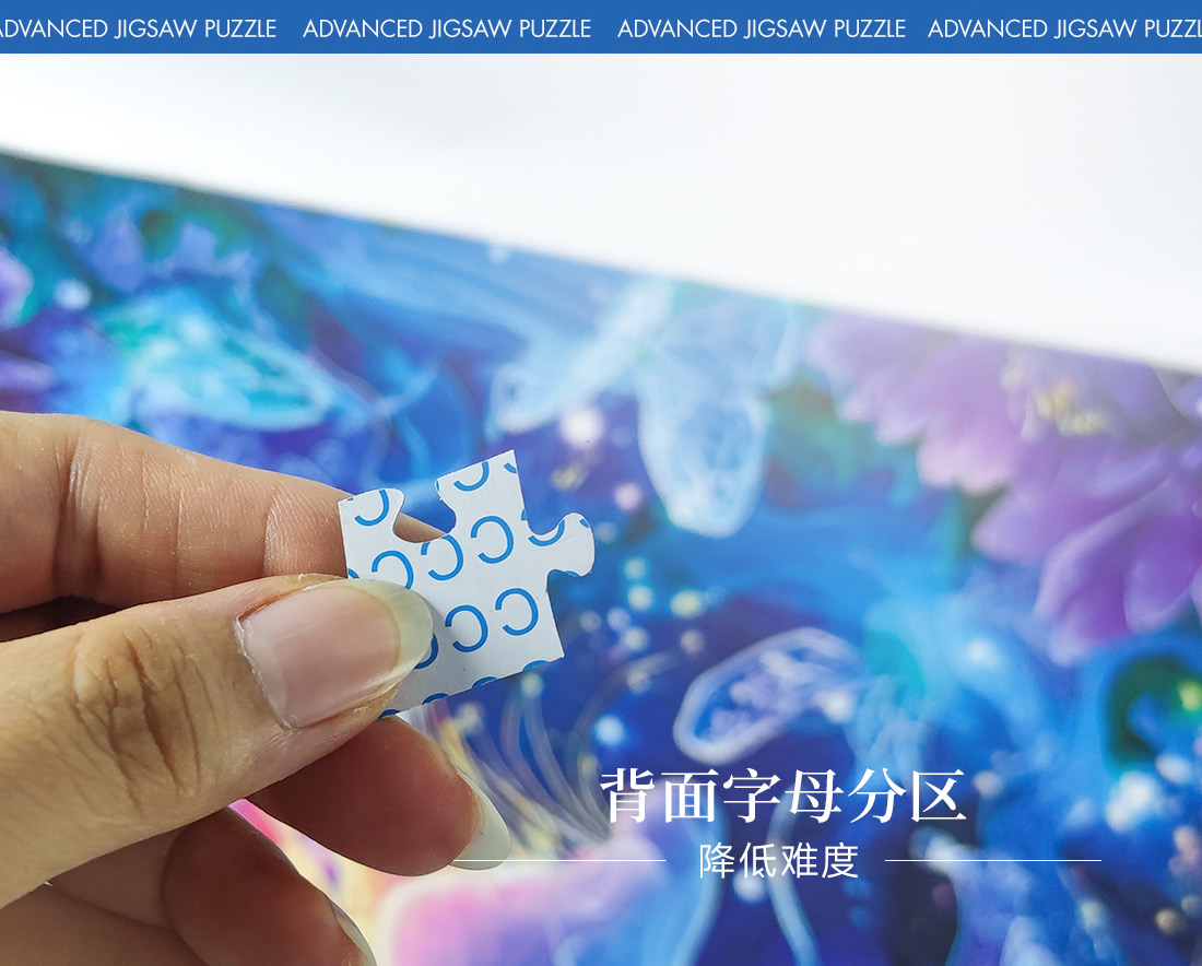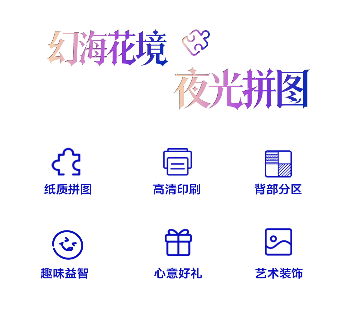 拼圖名稱:【幻海花境】夜光拼圖 拼圖尺寸:700*500MM 拼圖材質(zhì):紙質(zhì)灰卡 拼圖片數(shù):1000片 加工方式:廠規(guī)、來圖定制 包裝尺寸:180*130*50mm