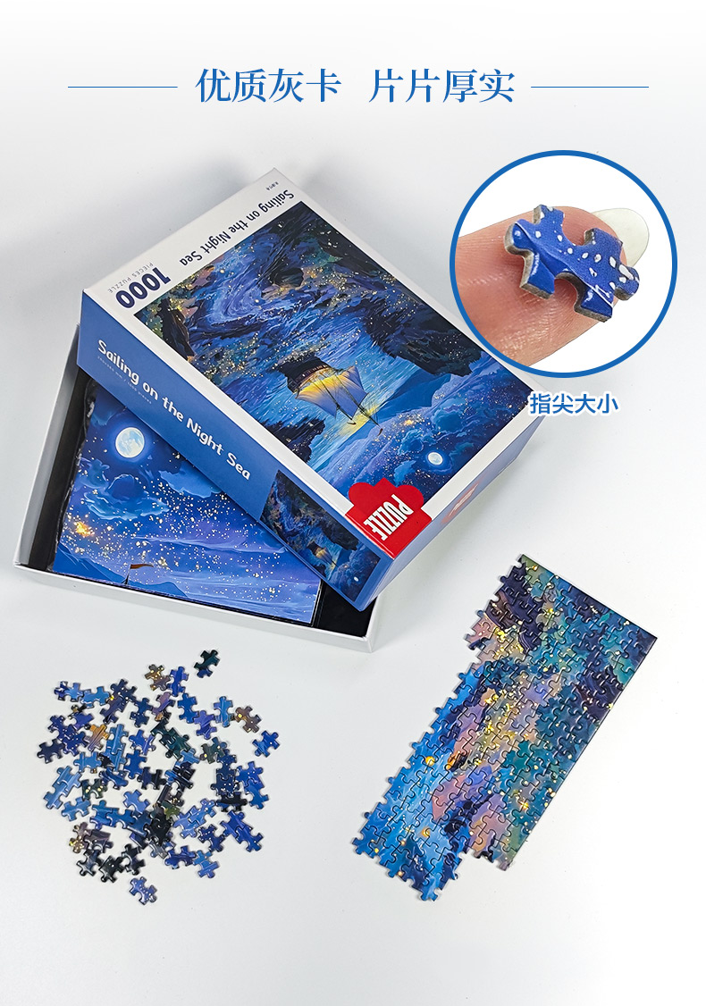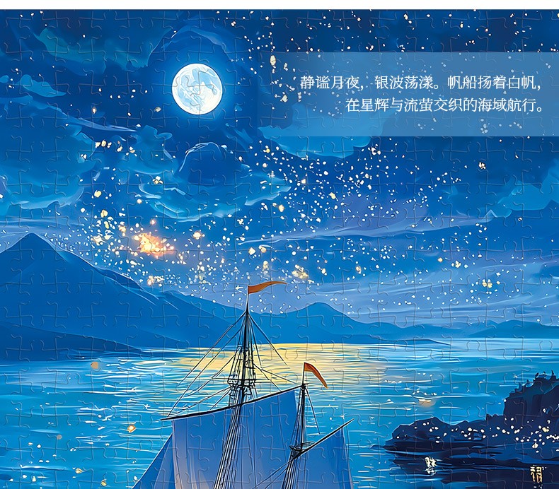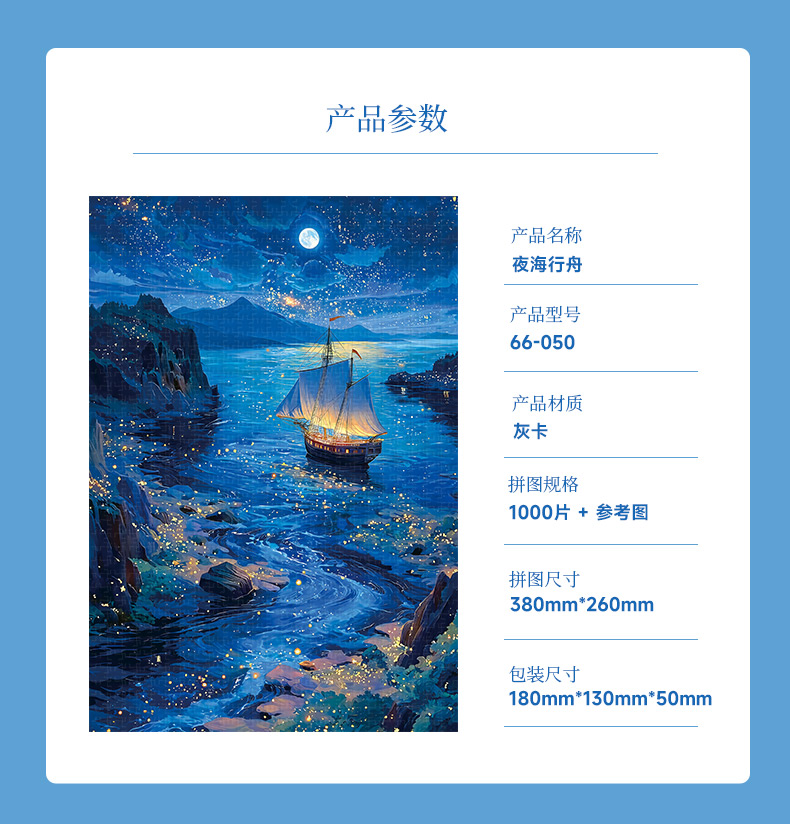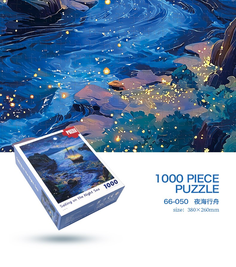 拼圖名稱:夜海行舟66-050 拼圖尺寸:380*260MM 拼圖片數:細微灰卡1000片 加工方式:廠規、來圖定制 包裝尺寸:180*130*50mm