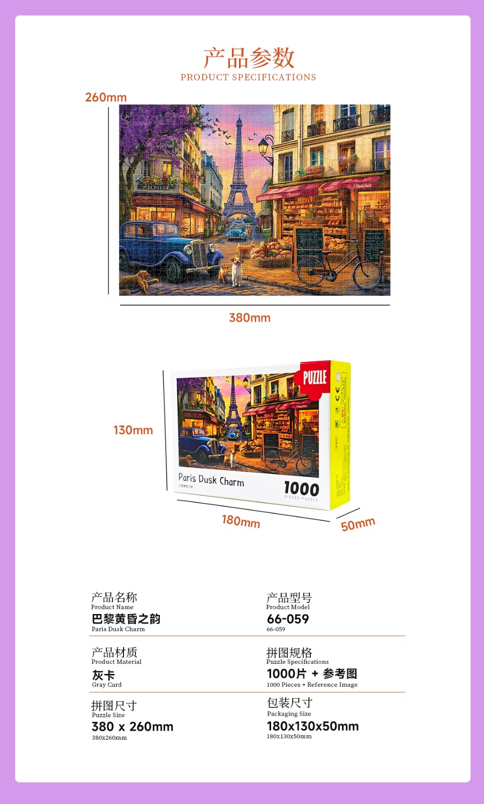 拼圖名稱:巴黎黃昏之韻 拼圖尺寸:380*260MM 拼圖片數:細微灰卡1000片 加工方式:廠規、來圖定制 包裝尺寸:180*130*50mm