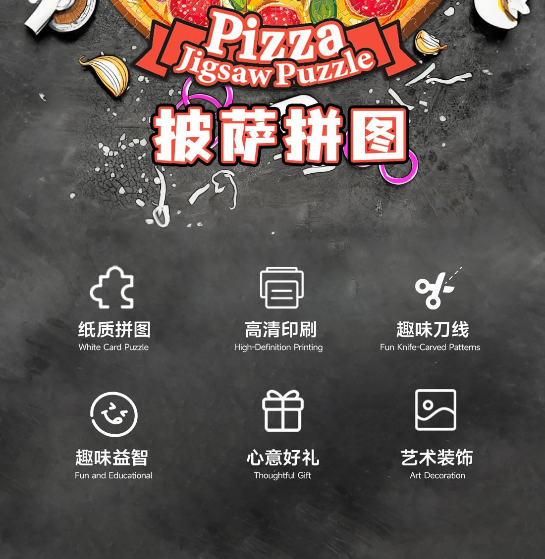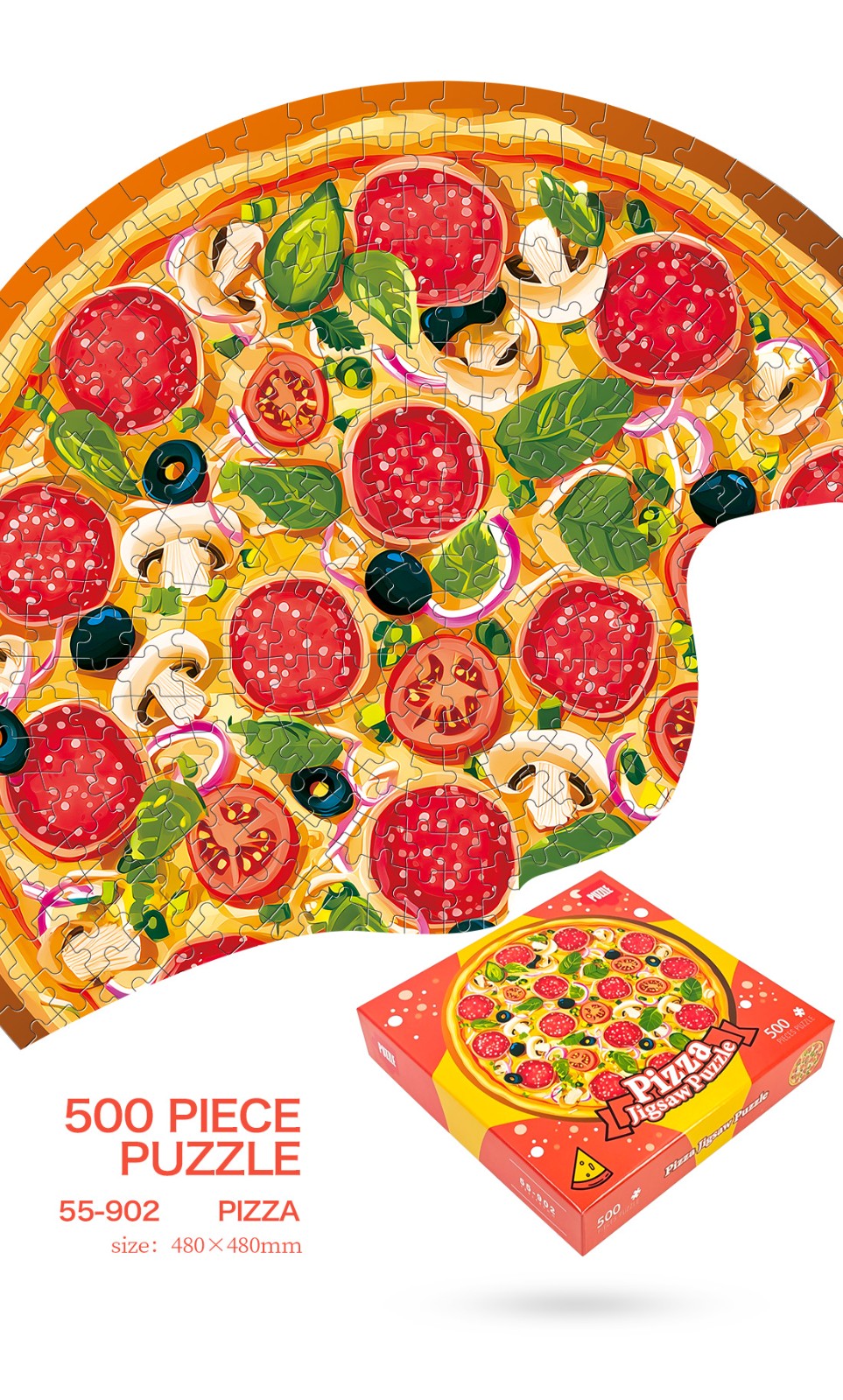 拼圖名稱:披薩-55-902 拼圖尺寸:480*480MM 拼圖材質:紙質白卡 拼圖片數:500片 加工方式:廠規、來圖定制 包裝尺寸:220*220*45mm