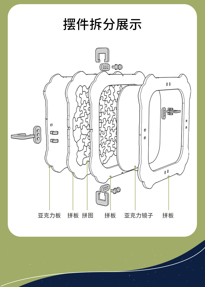 拼圖名稱:曼陀羅梳妝鏡拼圖 材質(zhì):木質(zhì) 拼圖尺寸:195*185*95mm 拼圖片數(shù):60/63片木質(zhì) 加工方式:廠規(guī)、來圖定制 包裝尺寸:190*190*40mm