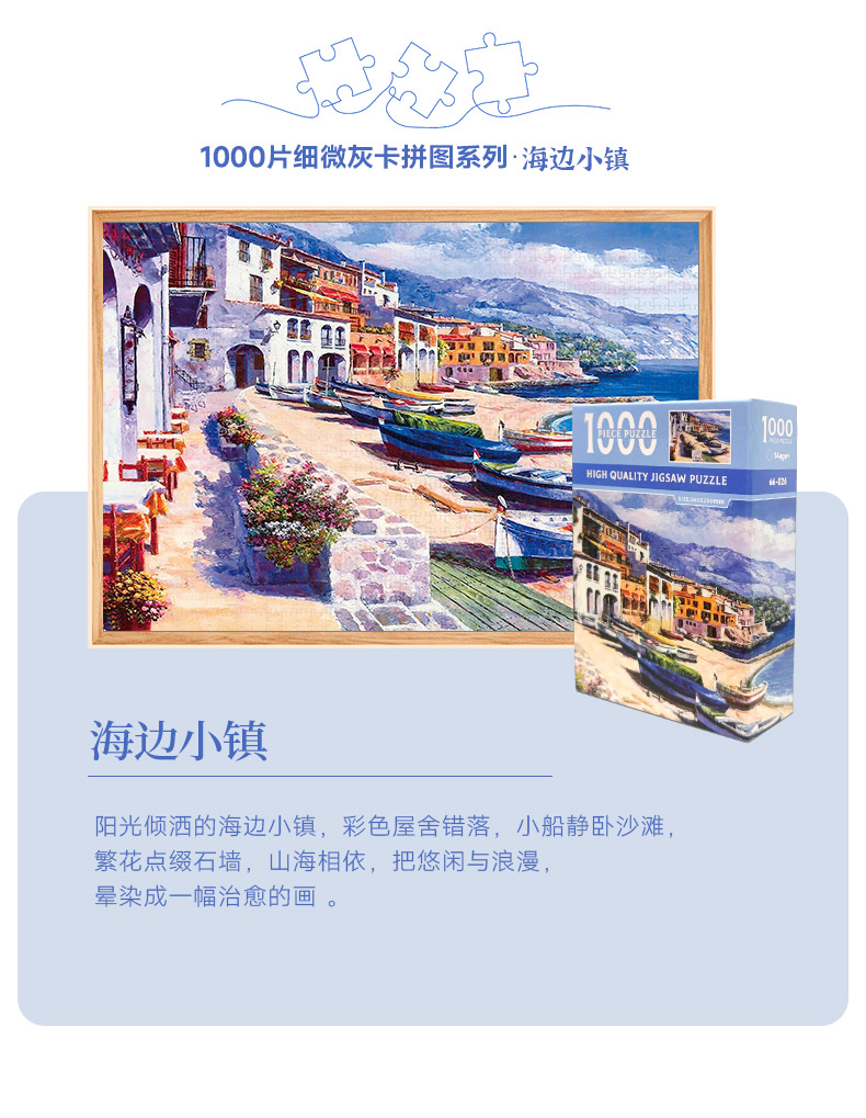拼圖名稱:海邊小鎮(zhèn) 拼圖尺寸:380*260MM 拼圖片數(shù):1000片 加工方式:廠規(guī)、來圖定制 包裝尺寸:180*130*50mm